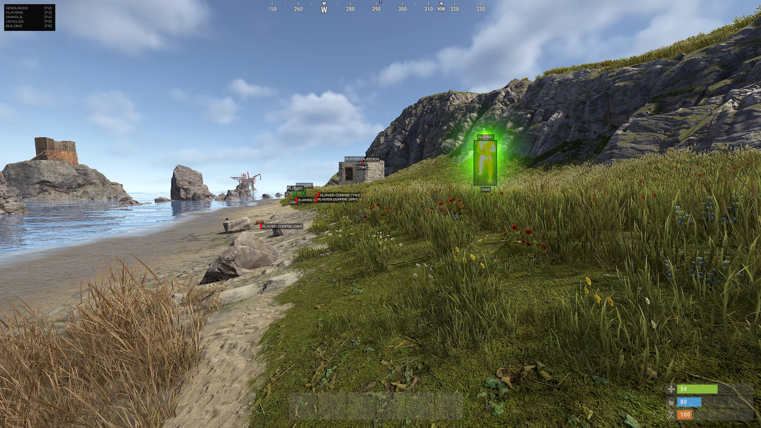 Phoenix Rust ESP provides an expanded overview of events in the Rust world. Players, NPCs, animals, vehicles, loot containers, harvestable resources, and key environmental objects are displayed. This allows planning routes in advance, avoiding unwanted encounters, and optimizing farming.