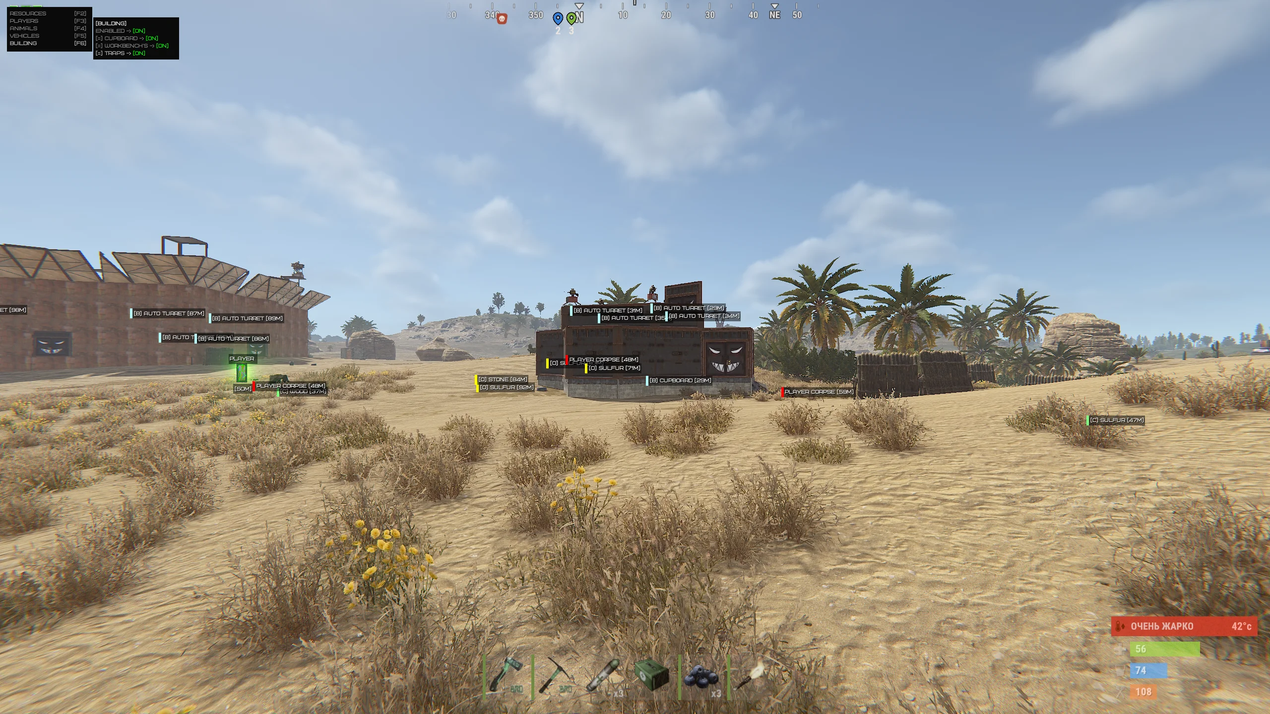 Building ESP highlights important base elements such as cupboards, workbenches, traps and key structures. This is especially useful during raids and reconnaissance, where every detail matters. The information is presented clearly without cluttering the interface, maintaining readability.